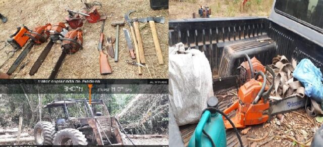 Com a localização, a equipe foi até o ponto e viram que as madeiras já estavam processadas e prontas para serem retiradas do local. No espaço estava um trator da marca Ford, modelo indefinido.