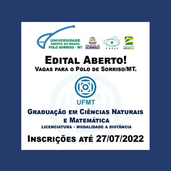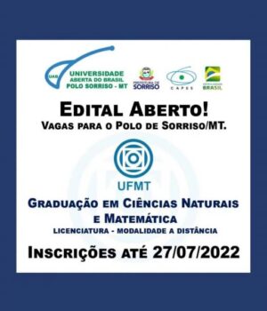 Estão abertas as inscrições para o processo seletivo do Curso de Graduação em Ciências Naturais e Matemática – modalidade à distância, da Universidade Federal de Mato Grosso (UFMT), vagas para o polo da Universidade Aberta do Brasil (UAB) Sorriso. As inscrições podem ser feitas até o dia 27 de Julho.