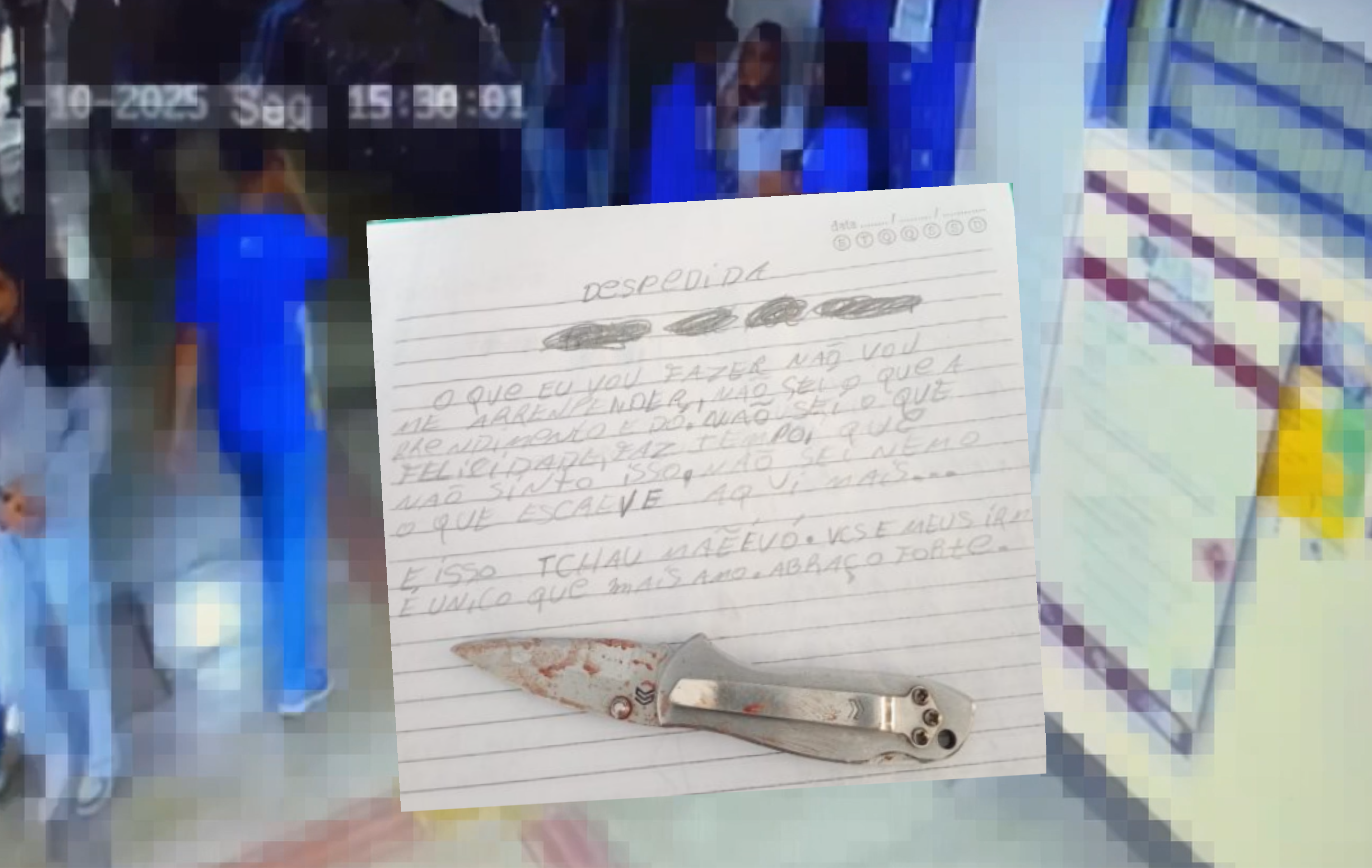 O agressor foi apreendido pela Polícia Militar ainda na segunda-feira. Com ele, os policiais encontraram o canivete utilizado e um bilhete manuscrito, no qual o adolescente afirma sofrer bullying e declara que não se arrepende do que fez. A mensagem tem tom de despedida, dirigida à mãe e à avó: “O que vou fazer não vou me arrepender, não sei o que é arrependimento e dó. Não sei o que é felicidade, faz tempo que não sinto isso. É isso, tchau mãe e avó. Vocês e meus irmãos, os únicos que mais amo, abraço forte.” O caso é investigado pela Polícia Civil e pela Secretaria de Estado de Educação (Seduc), que acompanha o atendimento às vítimas e reforça as medidas de segurança nas escolas.