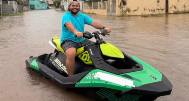 Em meio ao cenário de enchente, uma situação inusitada chamou atenção nas redes sociais. Um morador foi filmado utilizando um jet ski no meio da rua alagada. As imagens, divulgadas pelo Cáceres News MT, mostram o homem trafegando pela água acumulada enquanto casas e calçadas aparecem parcialmente submersas ao redor.