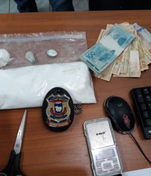 Em continuidade as diligências, os policiais seguiram até a residência do suspeito, onde foram apreendidas três porções de cocaína, totalizando aproximadamente ½ quilo da droga, uma porção de pasta base, balança de precisão e aproximadamente R$ 1,1 mil em dinheiro.