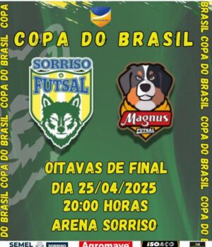 A ASF Sorriso vai encarar o Magnus nas oitavas de final da Copa do Brasil de Futsal 2025. O primeiro jogo será nesta sexta-feira (25), na Arena Sorriso, às 20 horas. De acordo com a Confederação Brasileira de Futsal (CBFS) a partida de volta está prevista para o dia 15 de maio, em Sorocaba (SP).