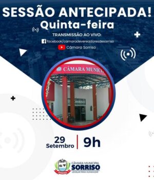 Devido à aprovação de urgência de alguns projetos do Poder Executivo, a Câmara Municipal de Sorriso, através da Portaria 145/2022, antecipará a 33ª Ordinária para quinta-feira (29), às 9h, no plenário.