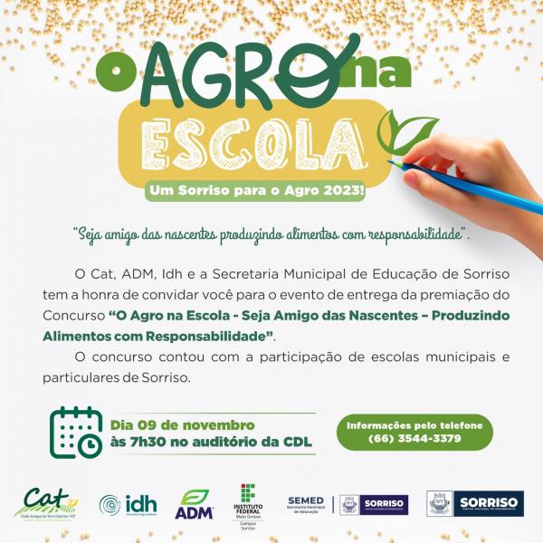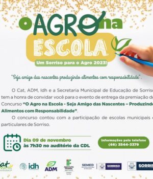 O Clube Amigos da Terra-CAT em parceria com a Prefeitura de Sorriso por meio da Secretaria Municipal de Educação (Semed), realiza na próxima quinta-feira (09), a entrega da premiação do concurso de videocast O Agro na Escola – Seja Amigo das Nascentes – Produzindo alimentos com responsabilidade, que tem a parceria da ADM, IDH, IFMT – Instituto Federal de Educação, Ciência e Tecnologia – campus Sorriso. O evento será promovido no Auditório da Câmara de Dirigentes Lojistas (CDL), às 7h30 da manhã.