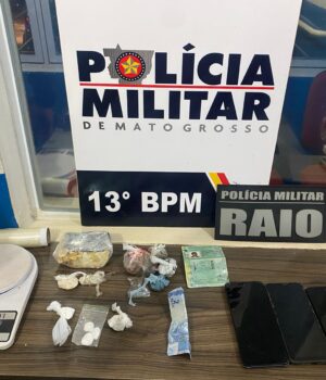 Equipes da Companhia de Rondas e Ações Intensivas Ostensivas (Raio) prenderam um homem de 25 anos por tráfico ilícito de drogas, na noite desta quinta-feira (05.09), em Lucas do Rio Verde. Com o suspeito, os militares apreenderam porções de substâncias análogas à cocaína e maconha.