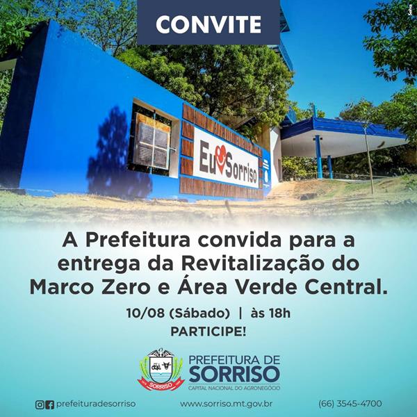 A prefeitura municipal de Sorriso convida a todos os municipes para a inauguração da revitalização da Área Verde Central. O ato de inauguração será amnhã(10), ás 18h00.