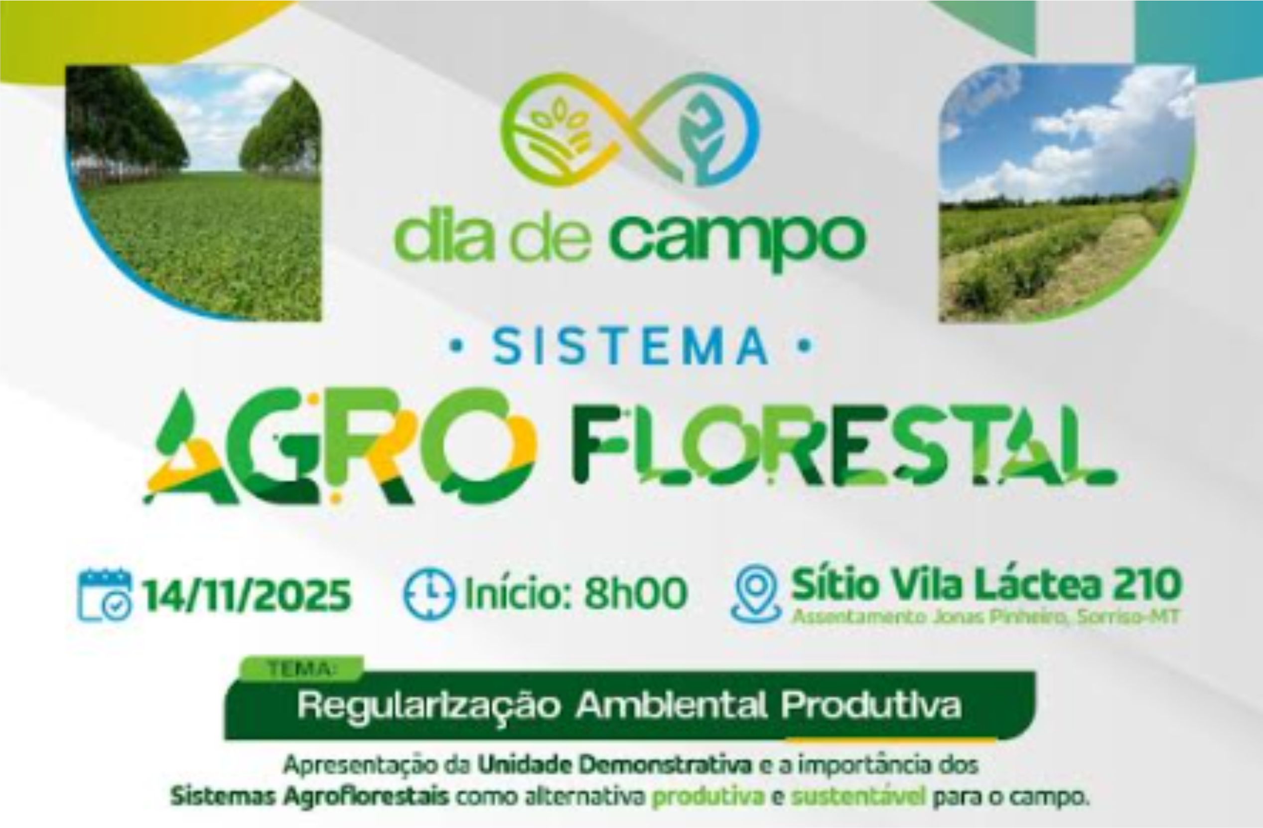 O Dia de Campo Sistema Agroflorestal é uma realização do CAT Sorriso, com apoio do sítio Vila Láctea, Embrapa e Empaer. O será um evento gratuito, voltado para os pequenos produtores rurais, estudantes e representantes de instituições públicas ligadas ao tema. A programação incluiu o debate sobre fruticultura, na agricultura familiar, no sistema agroflorestal. A inscrição pode ser feita pelo site: catsorriso.org.br.