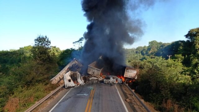 Dois caminhoneiros morrem carbonizados, após um grave acidente ocorrido na BR-163, em cima da ponte do Rio Arinos, já na cidade de Diamantino (181 quilômetros de Cuiabá). Ao todo, a colisão envolveu três veículos de carga, um de passeio e uma van. A rodovia ficou totalmente interditada e a Concessionária Rota do Oeste, responsável pelo trecho, teve que armar um plano de contingência.