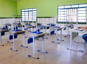 Na escola André Avelino Ribeiro, em Cuiabá, os cuidados de biossegurança são seguidos com álcool em gel disponível na entrada da escola, marcação para filas no chão e distanciamento dos alunos nas salas de aula.