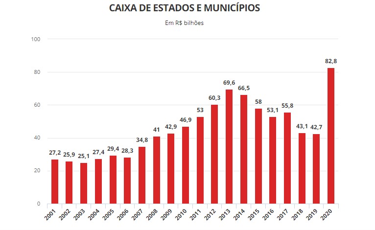 De acordo com as duas instituições, o saldo de estados e municípios passou de R$ 42,7 bilhões em 2019 para R$ 82,8 bilhões, no fim do ano passado, uma alta de 94%. Trata-se da maior disponibilidade de caixa para prefeitos e governadores em ao menos 19 anos (desde 2001; veja no gráfico, mais abaixo).