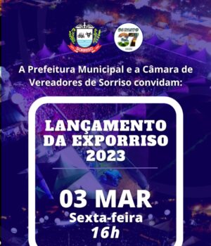 Hoje, sexta-feira(03), ás 16h00, a Prefeitura, a Câmara de Vereadores de Sorriso e a comissão organizadora, farão o lançamento oficial da Exporriso 2023.
