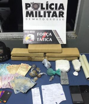 A suspeita foi abordada e, em revista a bolsa, os policiais militares encontraram cinco tabletes de maconha e a quantia de R$ 1.860,00 em dinheiro. Ao ser perguntada, a mulher afirmou que estaria tentando fugir após ser informada que seu esposo havia acabado de ser preso por uma equipe da Força Tática.