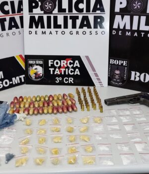 Policiais militares da Força Tática do 12º Batalhão de Sorriso apreenderam, na noite desta quinta-feira (14.11), uma pistola calibre 9 milímetros, 37 munições e 87 porções de pasta base de cocaína, além de um veículo Fiat Pálio, no município. Na ação, foram presos dois jovens, de 19 e 21 anos, por tráfico e associação criminosa.