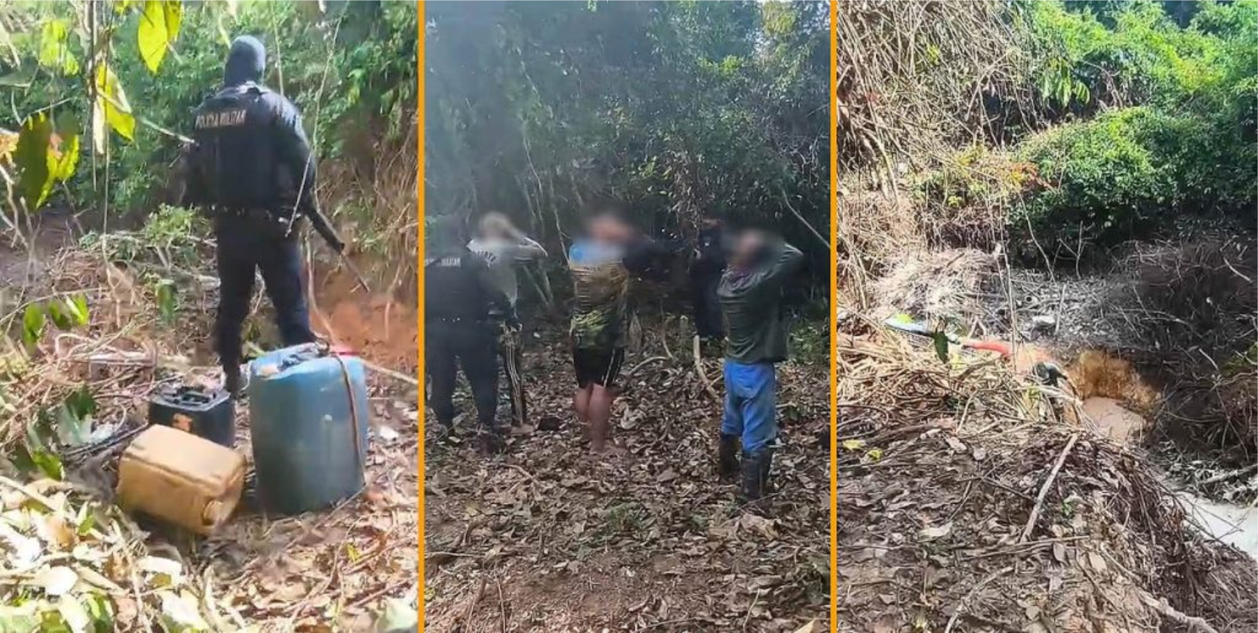 Em buscas realizadas no acampamento que servia de apoio ao garimpo, a PM encontrou cerca de 12 gramas de material semelhante a ouro, além de uma espingarda calibre 28 e uma espingarda de pressão adaptada para calibre .22. Também foi apreendida uma quantidade de mercúrio, substância altamente tóxica e de uso restrito, frequentemente associada à contaminação de solos e cursos d’água. Utensílios como bateias, mangueiras e galões de óleo diesel completavam a estrutura utilizada na extração ilegal.