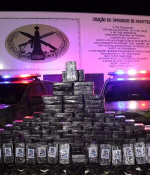 De acordo com o Gefron, foram apreendidos 40 tabletes de cloridrato de cocaína, pesando aproximadamente 42,3 quilos, avaliada em R$ 1,05 milhão e outros 100 tabletes de pasta base de cocaína, pesando cerca de 102,8 quilos, equivalente a R$ 1,8 milhão.