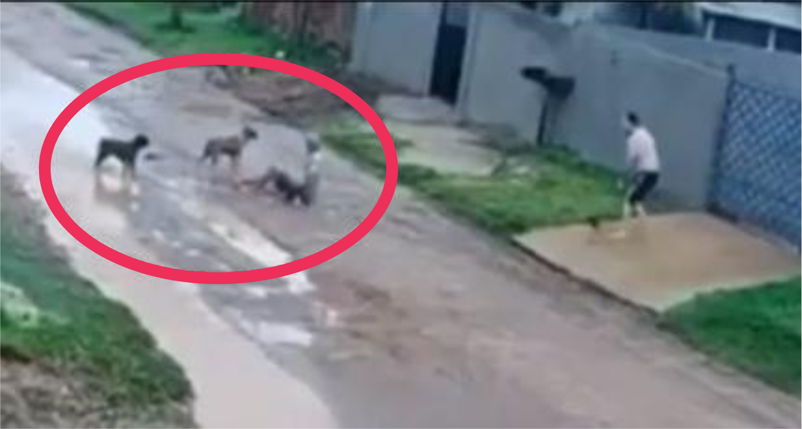 O vídeo mostra o idoso caminhando normalmente quando percebe a aproximação dos cães. Ele tenta espantá-los, mas os animais avançam de forma agressiva. Em poucos segundos, a vítima é derrubada e passa a ser mordida repetidamente.