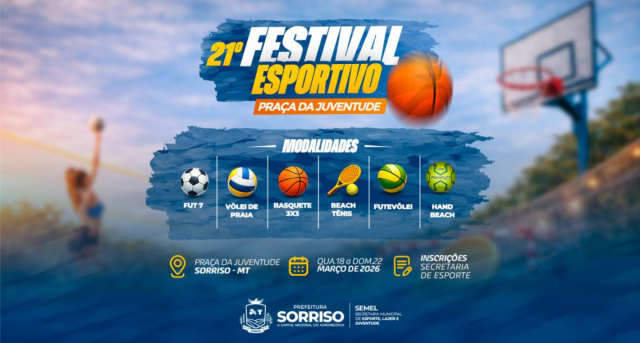 A Prefeitura de Sorriso, por meio da Secretaria Municipal de Esporte, Lazer e Juventude (Semel), abriu o período de participação para o 21º Festival Esportivo Praça da Juventude, programado para ocorrer entre os dias 18 e 22 deste mês, na Praça da Juventude. Os interessados têm até o próximo dia 13 para realizar o cadastro junto à sede da Semel.