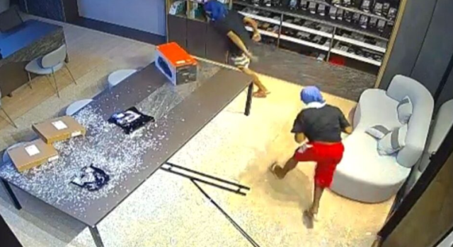 Imagens do sistema de monitoramento registraram o momento em que os criminosos arrombam a porta de vidro, que se estilhaça ao atingir uma mesa com expositores. Em seguida, o trio entra rapidamente na loja, recolhe diversos acessórios, abre caixas para retirar mercadorias e ainda leva dois aparelhos celulares pertencentes a clientes, que estavam no local para conserto e manutenção.