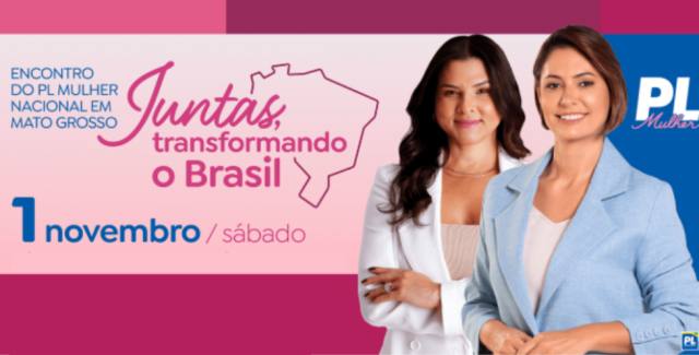 A ex-primeira-dama Michelle Bolsonaro, presidente nacional do PL Mulher, estará neste sábado (1º de novembro) em Sorriso (MT) para participar do Encontro Nacional do PL Mulher – “Juntas, transformando o Brasil”, um dos maiores eventos do partido no Estado neste ano.