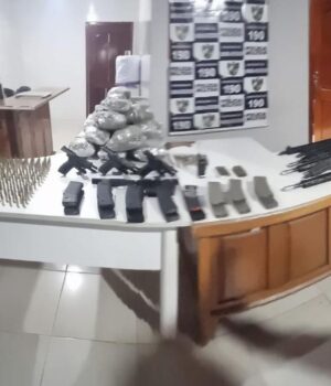 De volta ao Ônix, em vistoria ao veículo, a Polícia Militar encontrou diversos pacotes com substância análoga à maconha, totalizando 30 quilos de drogas. No porta-malas, os policiais localizaram seis fuzis de diversos calibres e quatro pistolas de calibre .9mm, além de carregadores e mais de 240 munições para o armamento.