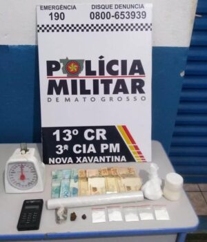 Em Nova Xavantina (645 km de Cuiabá), policiais da 3ª Companhia de Polícia Militar prenderam dois irmãos por tráfico de droga e apreenderam porções de cocaína embaladas em saquinhos plásticos, além de R$ 550 em dinheiro, balança de precisão, uma máquina da passar cartão, entre outros produtos.