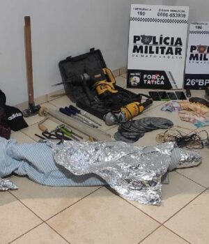 Em vistoria, foi constatado se tratar de um carro que fazia corridas por aplicativo com dois ocupantes, um homem e uma mulher. Na busca veicular, os policiais encontraram alguns materiais comumente utilizados para corte de cofres de agências bancárias.