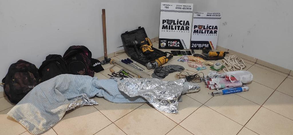 Mais equipes da PM foram acionadas e realizaram cerco à agência bancária. Os policiais entraram no local e encontraram os dois suspeitos no telhado, junto com outros materiais utilizados para corte. Os criminosos foram abordados e receberam voz de prisão em flagrante pela tentativa de furto.