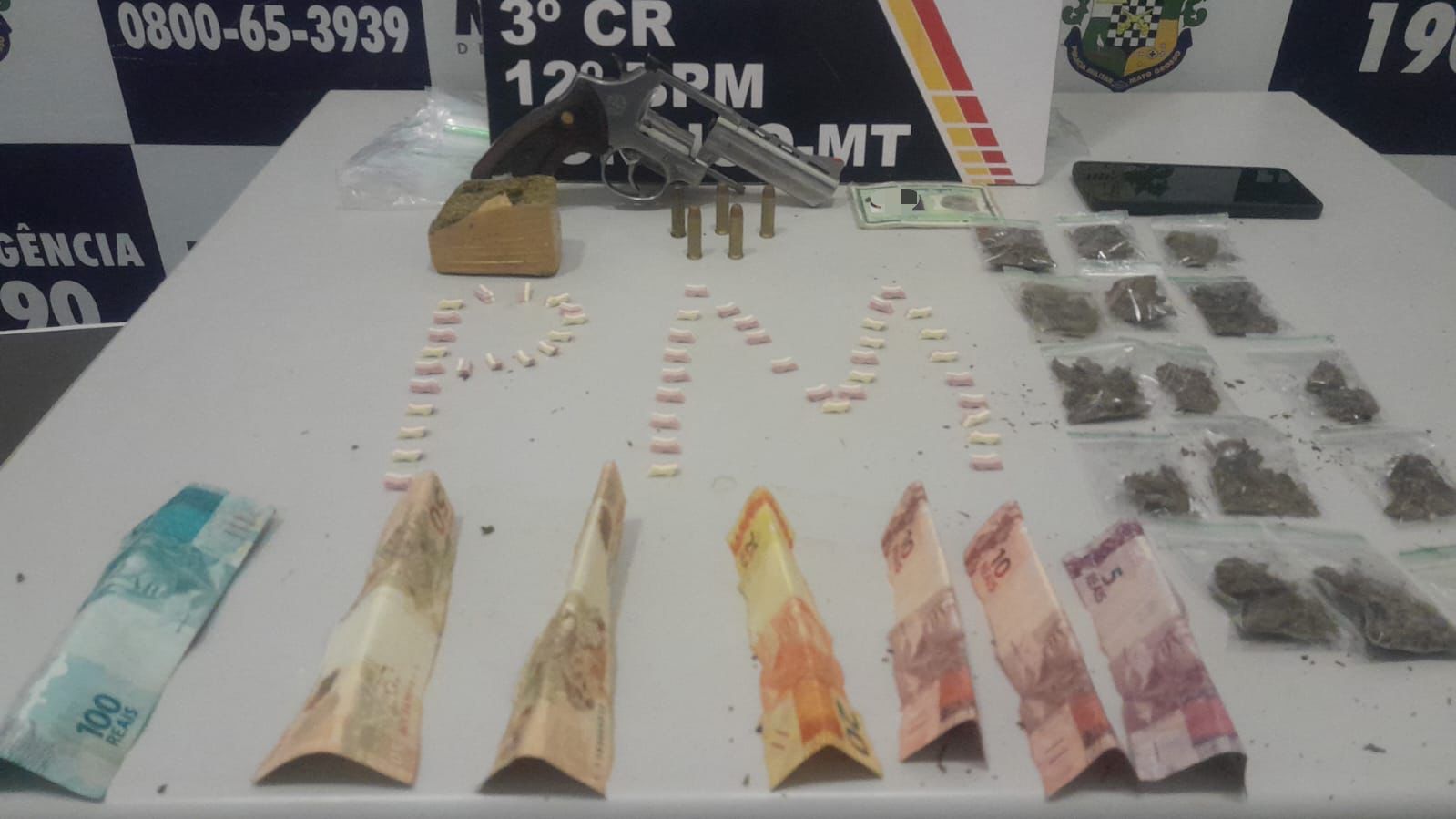 Policiais militares do 12º Batalhão prenderam um homem de 29 anos por tráfico ilícito de drogas e porte ilegal de arma de fogo, na noite deste sábado (21.09), em Sorriso. Com o suspeito, a PM apreendeu um revólver, porções de maconha e 50 comprimidos de ecstasy.