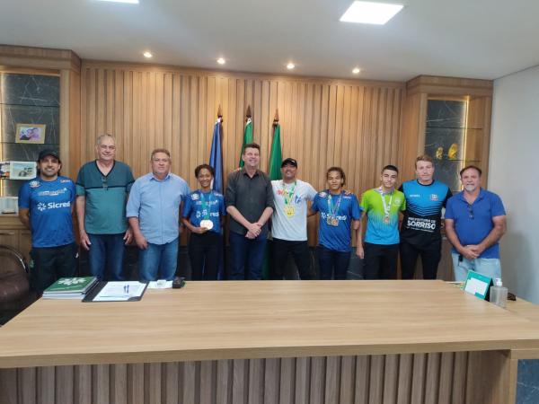 Foram recebidos com alegria pelo prefeito Ari Lafin, nesta manhã (29), os atletas da Associação Sorrisense de Atletismo (Asa Sorriso), Eduardo Furtado, o mais recente campeão brasileiro de paratletismo no salto em distância, disputado na categoria sub-20, e medalhista de bronze na modalidade de 100m rasos, também na mesma categoria; Isabelle Cristina, medalhista de bronze nas provas de corrida de 800m e 1500m, na categoria adulta no Troféu Brasil; Pedro Henrique, atleta da equipe Team Rech/Aspanat que conquistou o 3º lugar nos 100m costas no Campeonato Brasileiro Interclubes Infantil de Natação de Inverno, trazendo a primeira medalha de natação de uma competição nacional de natação para Sorriso; e ainda, o judoca Pedro Jarutas, campeão brasileiro CBJJE, na categoria faixa preta até 70 kg peso pena, no Campeonato Brasileiro de Jiu-jitsu.