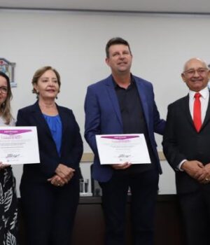 Durante o evento, o prefeito Ari Lafin e a primeira-dama e secretária de Assistência Social, Jucélia Ferro, receberam do TJMT, a menção honrosa do 1º Prêmio Juíza Glauciane Chaves de Melo – edição 2022, como reconhecimento pela parceria dos gestores do Poder Executivo no projeto “Rede Unificada de Proteção das Crianças, Adolescentes, Mulheres e Idosos”, vencedor Estadual na categoria Comarca.