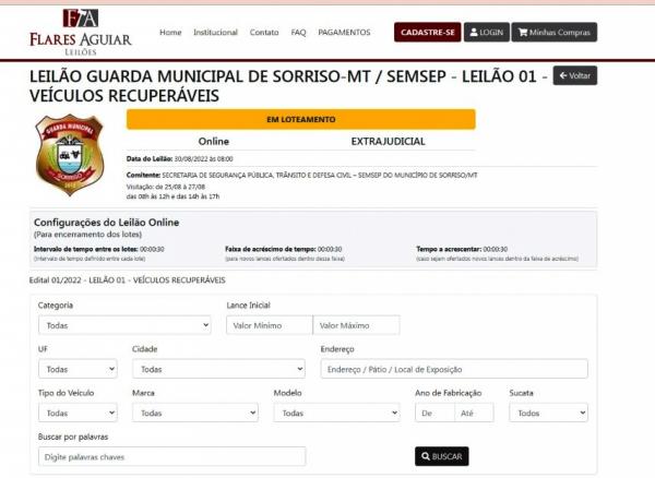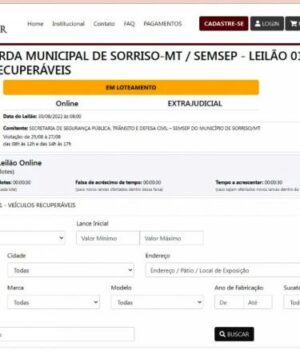 Assim como o anterior, este pregão será na modalidade virtual e viabilizado pelo leiloeiro Flares Aguiar da Silva. Para participar do processo, basta acessar o site faleiloes.com.br. No leilão 01, estão disponíveis os dados de todos os 668 lotes disponíveis de veículos recuperáveis. A abertura deste leilão será às 8h do dia 30 de agosto. Já no leilão 2, que será aberto às 8h do dia 1.º de setembro, estarão disponíveis 524 lotes de sucata aproveitável com motor inservíveis.