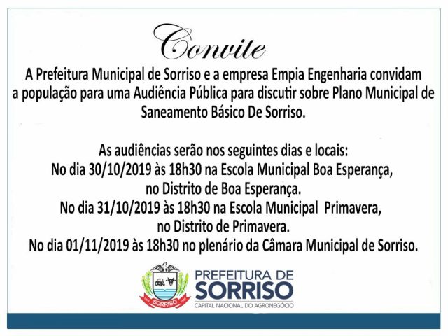 A Prefeitura de Sorriso vai realizar três audiências públicas para discutir a implantação do Plano Municipal de Saneamento Básico De Sorriso. Participarão das audiências os técnicos da empresa Empia Engenharia.