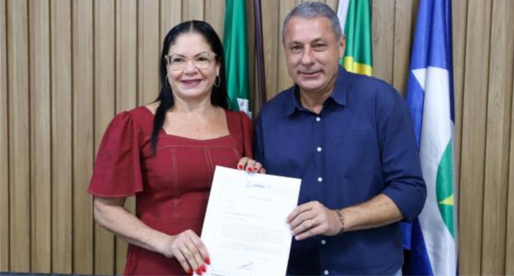 As duas mulheres integraram um grupo de 18 pessoas que vieram até o gabinete do prefeito Alei Fernandes receber o documento que viabiliza a emissão, no cartório, das escrituras de imóveis localizados nos bairros São José, Nova Aliança, São Francisco e São Domingos.