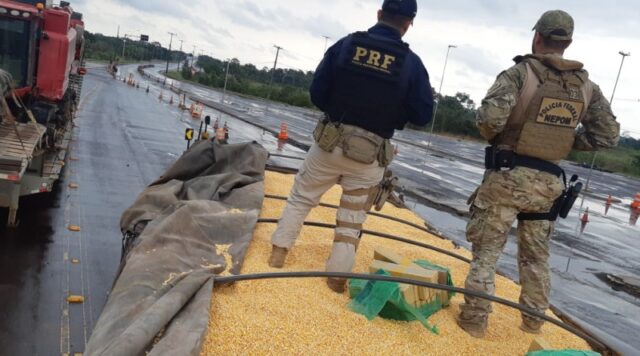 Por volta do meio-dia, policiais abordaram um motorista de 26 anos, que conduzia uma carreta, na BR-163, na ponta Ayrton Senna.na manhã deste sábado (15). Perguntado, o motorista disse estar carregando milho, apresentando a nota fiscal do produto transportado às equipes policiais.