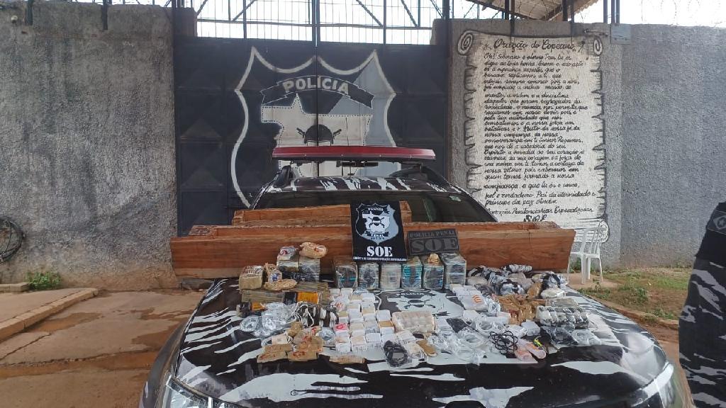 Policiais penais do Serviço de Operações Especiais (Soe), da Secretaria-adjunta de Administração Penitenciária da Segurança Pública, apreenderam uma carga com 85 celulares e cerca de 2,5 kg de maconha durante operação na Penitenciária Central do Estado (PCE), em Cuiabá.