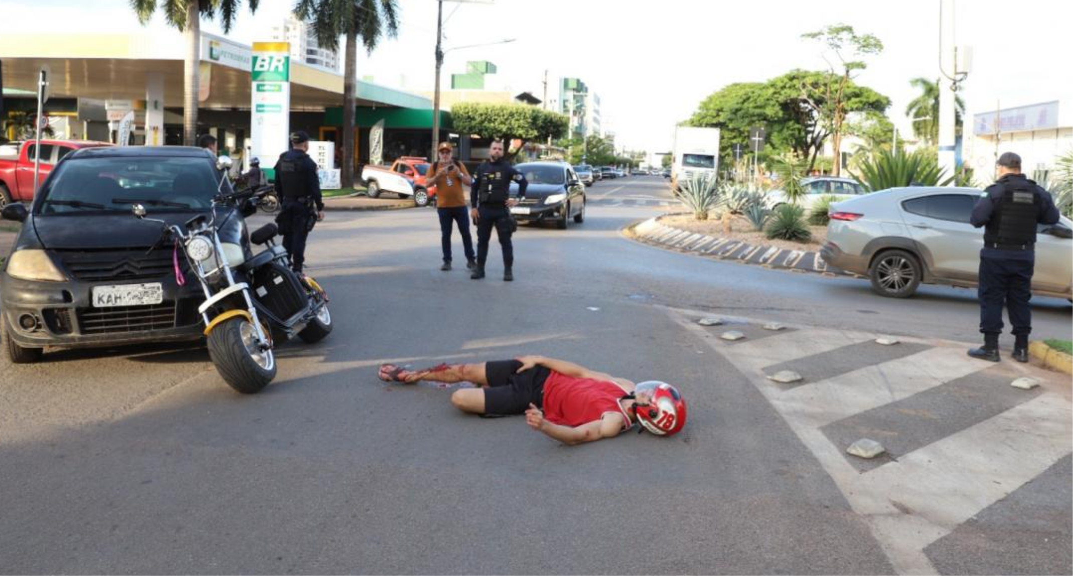 Uma ação educativa chamou a atenção de quem passou, nesta quinta-feira (05), pelo cruzamento da Avenida Blumenau com a Perimetral Sudoeste, em Sorriso. O que parecia um grave acidente envolvendo dois adolescentes em uma bicicleta elétrica era, na verdade, uma encenação organizada para alertar sobre os riscos no trânsito. O cenário simulava vítimas com trauma cranioencefálico e fraturas expostas, mobilizando equipes do Corpo de Bombeiros Militar, da Guarda Municipal de Trânsito e da imprensa.