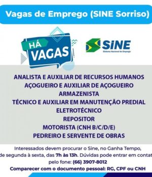Os interessados em alguma dessas vaga, devem dirigir-se até o Sine, que funciona no Ganha Tempo de Sorriso, portando os seguintes documentos : RG, CPF ou CNH para emissão do encaminhamento para vaga.