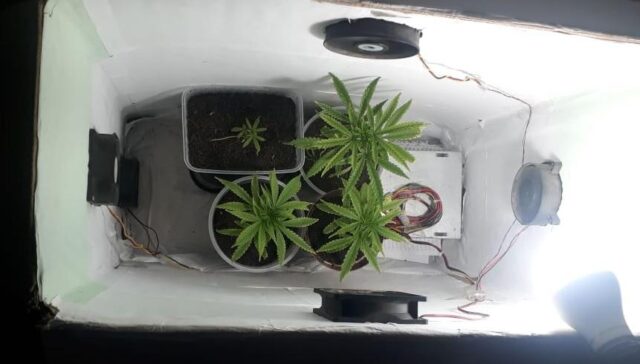 Os militares foram até o cômodo e confirmaram a informação. A estufa improvisada estava em uma caixa de isopor com quatro mudas da droga.