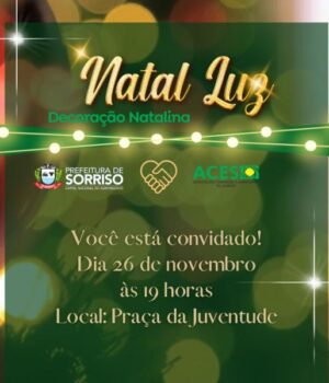 O “Natal Luz” de Sorriso será oficialmente lançado neste sábado, 26 de novembro, a partir das 19h, no Palco Cultural 2022, da Praça da Juventude, com acendimento das luzes e a chegada do Papai Noel.