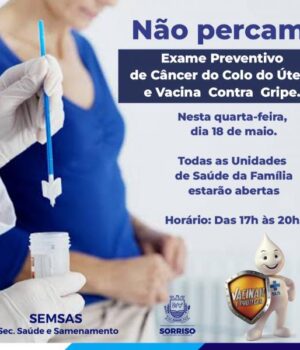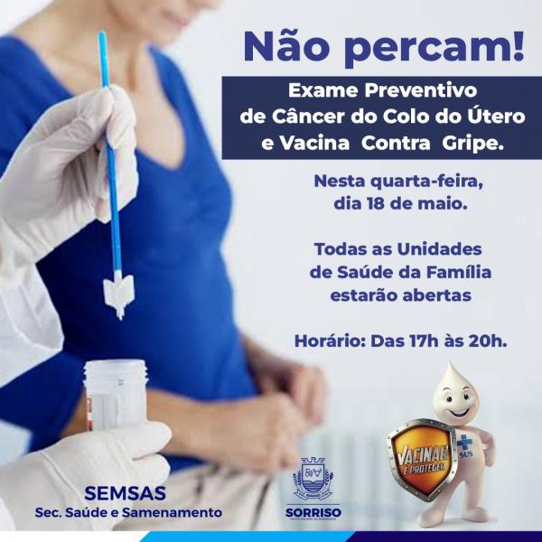 Todas as 28 Unidades de Saúde da Família estarão abertas na quarta-feira (18) em horário estendidos, das 17h às 20 para coleta de exames preventivos de Câncer do colo do útero e aplicação da vacina contra Gripe. O exame preventivo é indicado para mulheres na faixa etária de 25 à 64 anos de idade, já a vacina da gripe deve seguir o público definido pelo Ministério da Saúde.