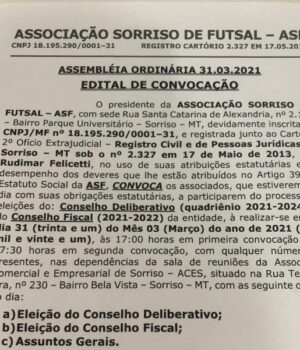A Associação Sorriso de Futsal (ASF) está convocando os associados que estiverem em dia com suas obrigações estatutárias a participarem do processo de eleição do Conselho Deliberativo para o quadriênio 2021/2024; e do Conselho Fiscal, para o biênio 2021/2022.