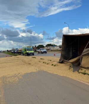 Início Editorias Polícia Sorriso: Bitrem tomba ao fazer contorno na BR163