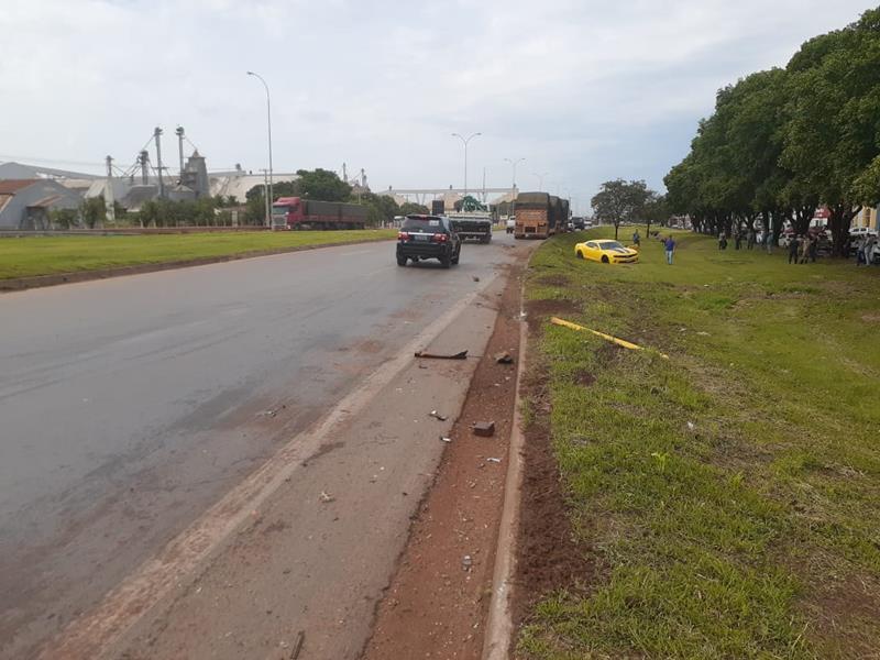 Com a colisão o Camaro foi arremessado pra fora da pista e ficou bastante destruído. O condutor do veículo de luxo saiu ileso.