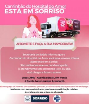 A Prefeitura Municipal, por meio da Secretaria de Saúde informa, que o Caminhão do Amor, está atendendo em Sorriso dos dias 03 a 07 de junho. Os atendimentos começaram às 13h desta segunda-feira (03) e se encerram as 11h de sexta-feira (07).