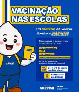A iniciativa, que une as Secretarias de Saúde e Educação, está passando por escolas e Cemeis de todo o município com o tema “Em matéria de vacina, Sorriso é nota 10!”. A proposta é simples e eficiente: levar a vacina até as crianças, sem que elas precisem sair do ambiente escolar, ampliando a proteção e evitando que doenças preveníveis voltem a circular.