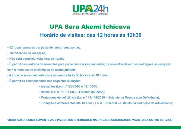 Que a UPA Sara Akemi Ichicava de Sorriso atende um grande número de pacientes diariamente, todo mundo já sabe. O que a Secretaria de Saúde e Saneamento (Semsas) quer informar são algumas alterações implantadas nos últimos dias. A UPA está dando suporte com internações. Isso no caso de pacientes que estão sendo atendidos no espaço e que a equipe clínica vem constatando ou a necessidade de internação em serviços hospitalares ou da realização de outros serviços de saúde.