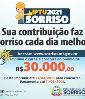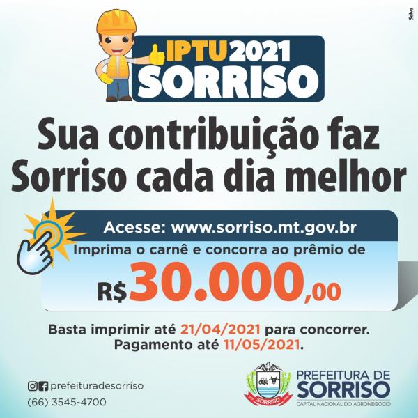 Por meio do decreto 506, a Prefeitura prorroga até o dia 2 de maio o prazo para contribuintes concorrerem ao prêmio de 30 mil, que será sorteado entre os contribuintes que emitirem, pelo site www.sorriso.mt.gov.br, a guia do Imposto Predial e Territorial Urbano (IPTU). O documento pode ser tanto impresso em papel para ser quitado, quanto salvo digitalmente para ser pago por aplicativo.