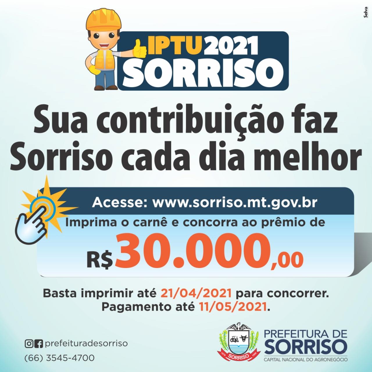 Vale lembrar que continua sendo possível gerar on-line a guia do IPTU, pelo site www.sorriso.mt.gov.br, sem precisar se dirigir até a Prefeitura. O que muda, agora, é que não é mais possível concorrer ao prêmio de R$ 30 mil, que será disputado por todos os contribuintes que emitiram a guia pela internet até o prazo estipulado, que inicialmente era até dia 21 de abril, mas que foi ampliado até dia 2 de maio.