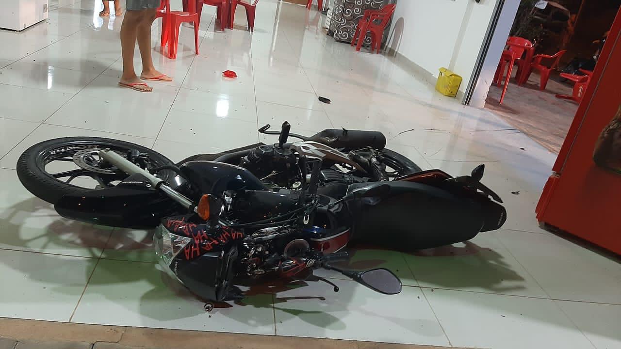 Sorriso: Em acidente grave, motociclista acaba embaixo de carro e moto dentro de estabelecimento