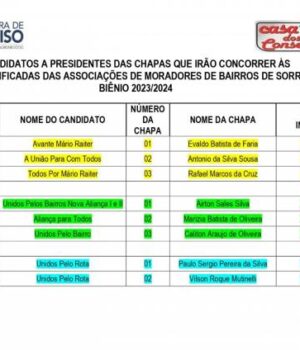 Dos 19 bairros sorrisenses que cadastraram chapas para coordenar as associações de moradores, somente em três haverá disputa para a escolha do presidente da associação e demais representantes comunitários: Mário Raiter, Nova Aliança e Rota do Sol.